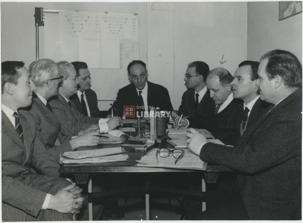 titolo attribuito | Guido Weiller a una riunione di lavoro con gli altri ingegneri del gruppo progettazione |