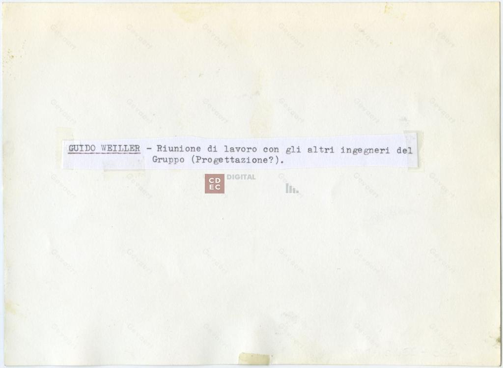 iscrizioni | sul verso del supporto รจ incollato con lo scotch un appunto su carta con la nota dattiloscritta "Guido Weiller - Riunione di lavoro con gli altri ingegneri del Gruppo (Progettazione?)." |