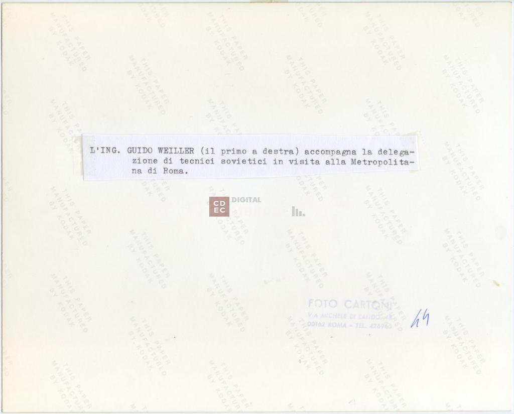 iscrizioni | sul verso del supporto รจ incollato un appunto su carta con la nota dattiloscritta "L'ing. Guido Weiller (il primo a destra) accompagna la delegazione di tecnici sovietici in visita alla Metropolitana di Roma." |