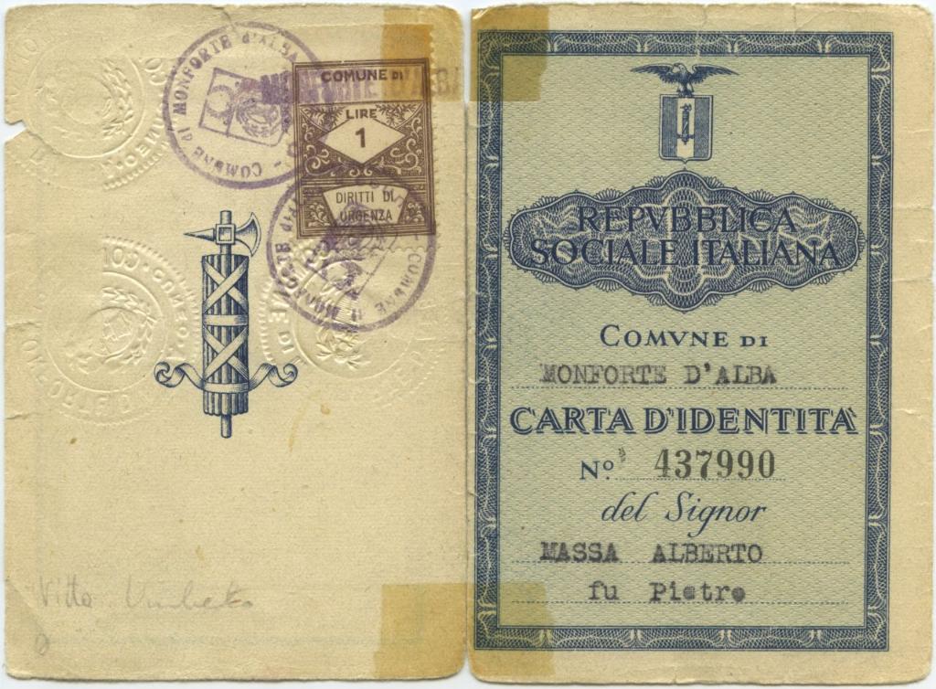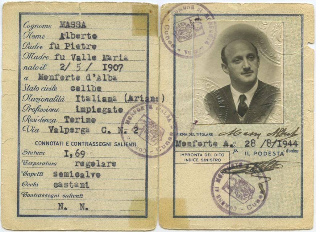| notizie storico-critiche | Il documento della Repubblica Sociale Italiana con la falsa identità di Alberto Massa, di Pietro e Maria Valle, nato a Monforte d'Alba il 2 maggio 1907, reca la data del 28 agosto 1944 |