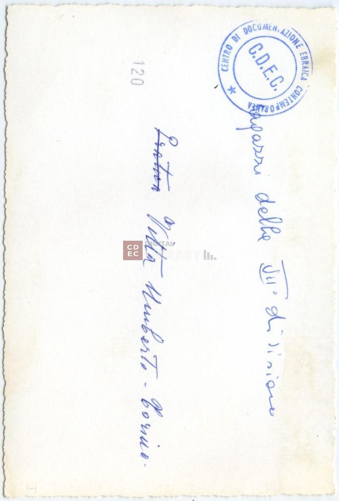 | timbri, marchi | sul verso del supporto il timbro circolare a inchiostro blu con la scritta lungo il bordo "Centro di Documentazione Ebraica Contemporanea" e al centro "C.D.E.C." |