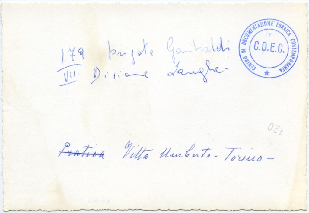 | iscrizioni | sul verso del supporto l'indicazione manoscritta a penna blu "179 brigata Garibaldi/ VII divisione/ Vitta Umberto - Torino" |