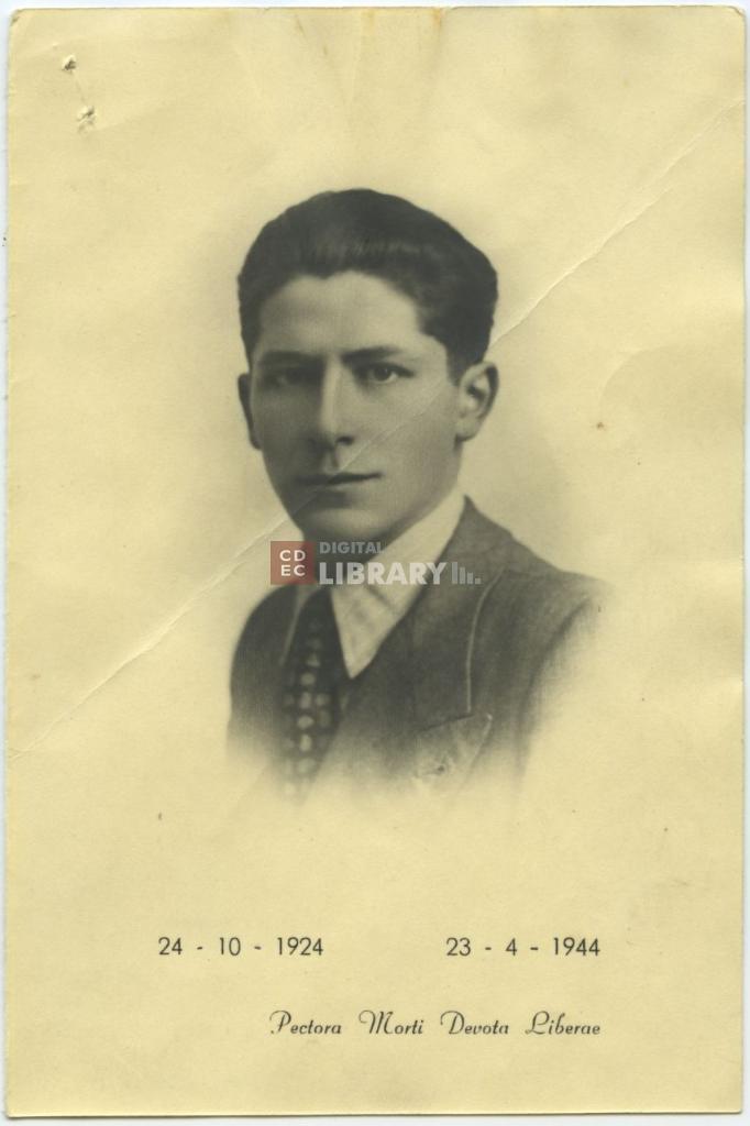 notizie storico-critiche | Cartoncino "foto-ricordo" in memoria di Ildebrando (detto Ildo) Vivanti, fucilato dai tedeschi il 23 aprile 1944. Sono riportate le date di nascita e di morte dell'effigiato e il motto in latino "Pectora Morti Devota Liberae" (trad. "Gli animi a libera morte devoti", dalle Odi di Orazio, libro IV, XIV, vv. 18-19) |