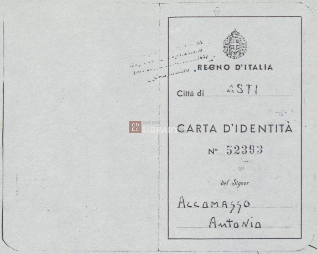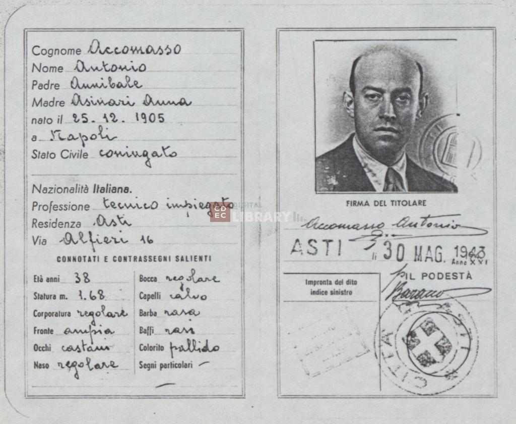 titolo attribuito | Carta d'identità con false generalità di Cesare Artom (alias Antonio Accomasso) |