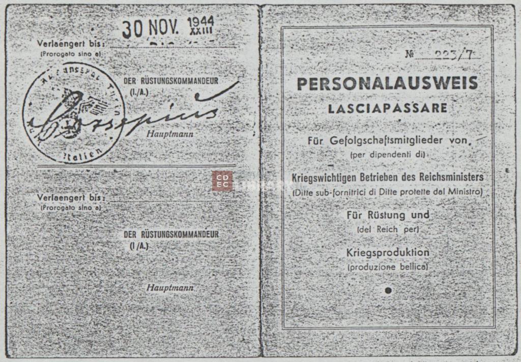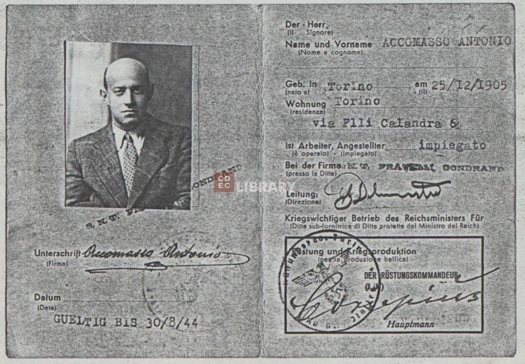 notizie storico-critiche | Il lasciapassare - redatto in italiano e in tedesco - veniva consegnato ai "dipendenti di ditte sub-fornitrici di ditte protette dal Ministro del Reich per produzione bellica"; Cesare Artom (indicato con il nome falso di Antonio Accomasso) risulta impiegato presso la ditta S.N.T. Fratelli Gondrand |