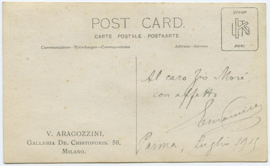 | iscrizioni | sul retro del supporto in basso a destra la dedica manoscritta "Al caro zio Mosè con affetto Emanuele/ Parma, Luglio 1915" e in basso a sinistra il marchio commerciale del fotografo con la scritta tipografica "V. Aragozzini/ Galleria De Cristoforis. 58, Milano" |