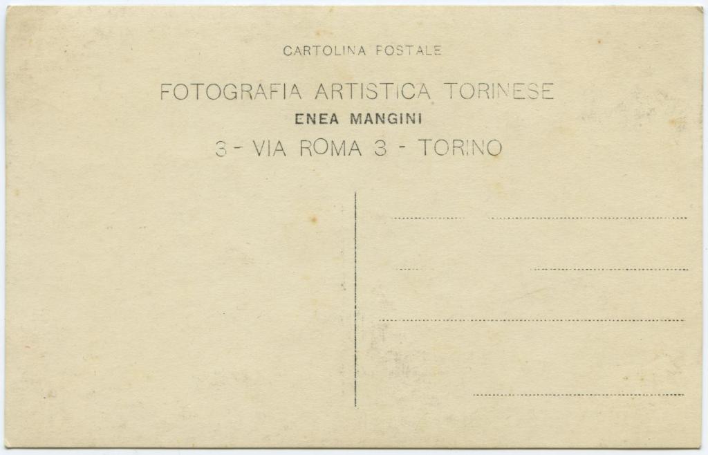 | iscrizioni | sul retro del supporto in alto la scritta tipografica "Cartolina postale" e il marchio commerciale del fotografo con la scritta tipografica "Fotografia Artistica Torinese/ Enea Mangini/ 3 - Via Roma 3 - Torino" |