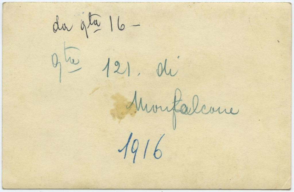 | iscrizioni | nell'immagine in alto la scritta "Monfalcone qta 16" - sul verso del supporto le indicazioni manoscritte a penna "da qta 16/ qta 121 di Monfalcone/ 1916" |