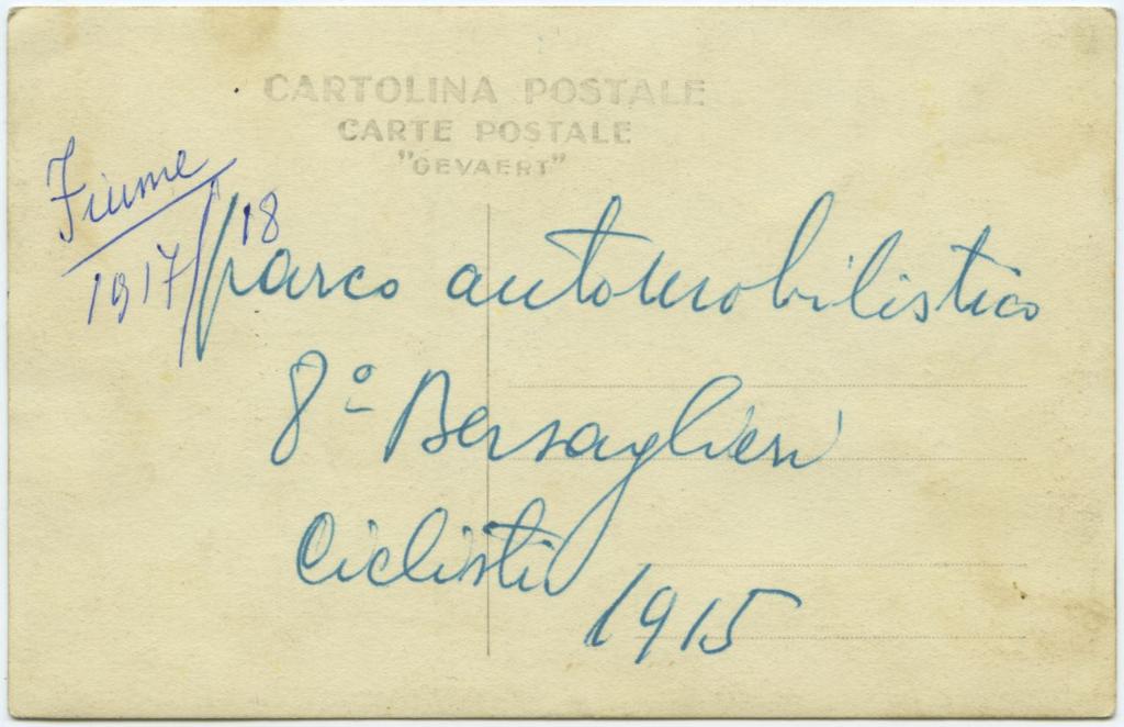 | iscrizioni | sul verso del supporto le indicazioni manoscritte a penna "Fiume 1917/18" e "parco automobilistico 8° Bersaglieri Ciclisti 1915" |
