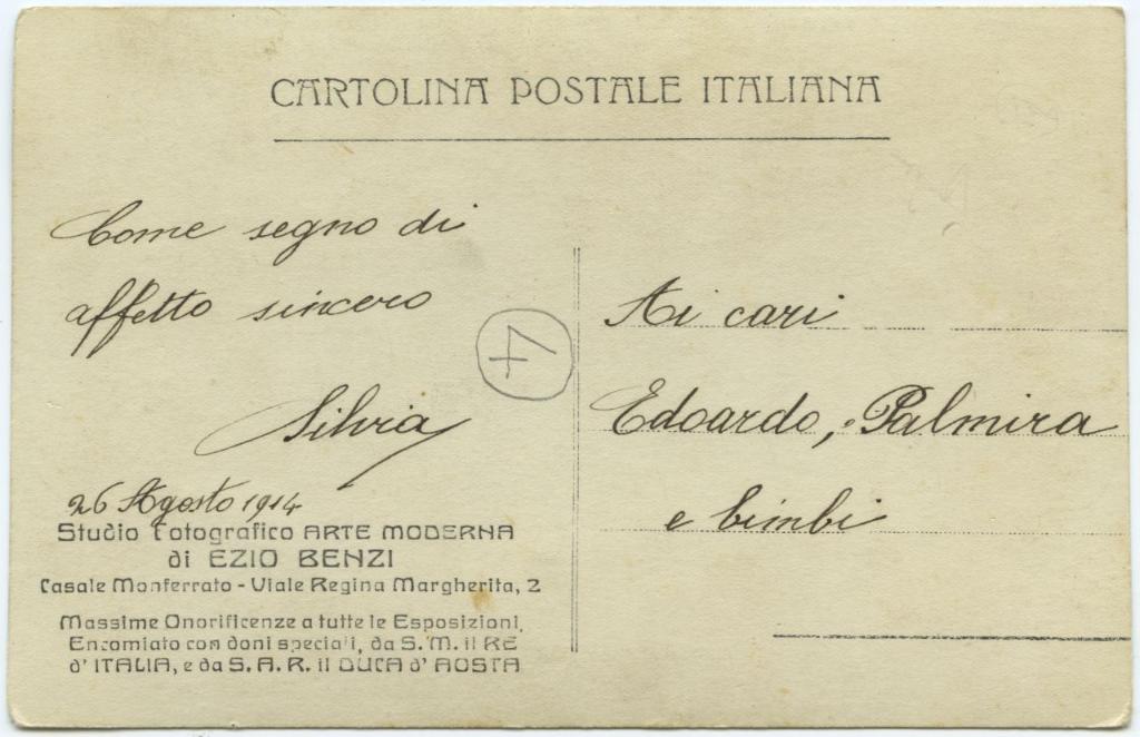 | iscrizioni | sul verso del supporto l'intestazione "Ai cari Edoardo, Palmira e bimbi" e la dedica "Come segno di affetto sincero. Silvia/ 26 Agosto 1914" |