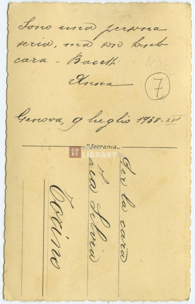 | iscrizioni | sul verso del supporto l'intestazione manoscritta "Per la cara Zia Silvia/ Torino" e la dedica "Sono una persona seria, ma sono tanto cara. Bacetti Anna/ Genova, 9 luglio 1938 - XVII" |