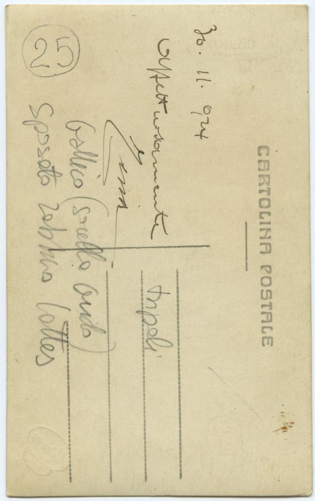 | iscrizioni | sul verso del supporto la dedica "30.11.924 Affettuosamente [Tessa]" seguita dall'indicazione a matita "Gallico (sorella Guido) sposata rabbino Lattes/ Tripoli" |