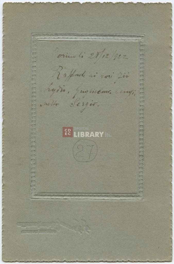 | iscrizioni | sul verso del supporto secondario la dedica "Torino li 27/12/1922 Raffaele ai cari zii Silvia, Guglielmo e cugino Sergio" |