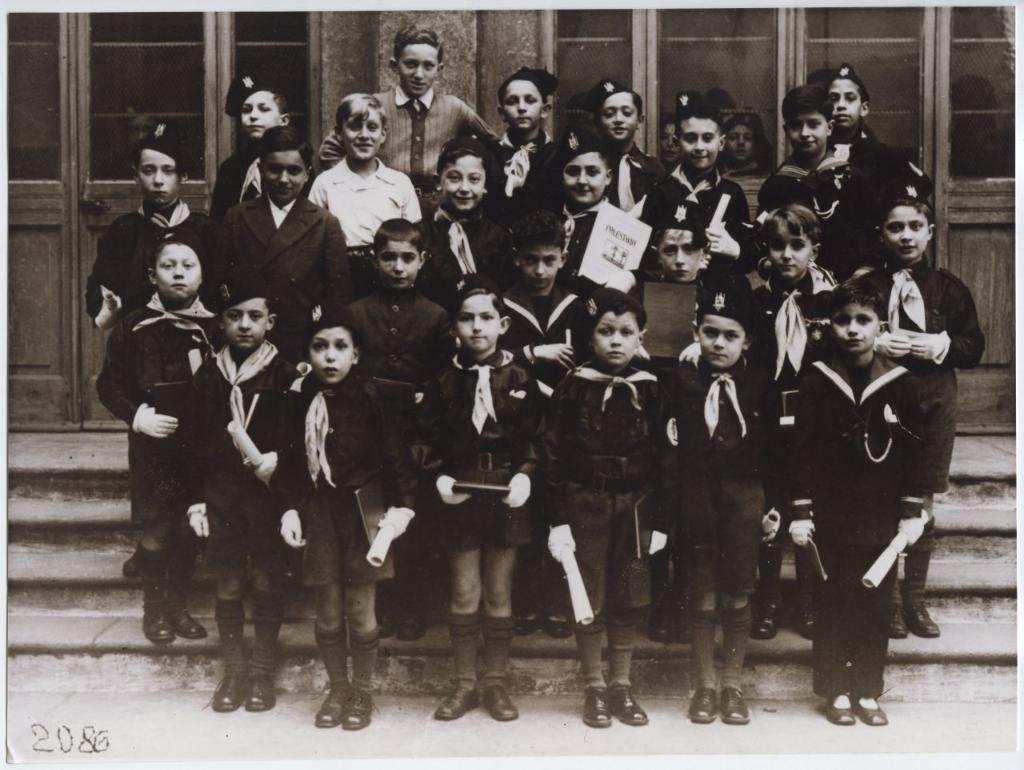 | osservazioni | Tra gli alunni della classe elementare della scuola Colonna e Finzi, si riconoscono in prima fila da sinistra Bruno Frassineti, Aldo Gallico, Guido Treves, Giorgio Ovazza, [bambino non identificato], Walter Rossi; in seconda fila da sinistra sul primo gradino: Franco Fubini, [due bambini non identificati], Cesare Sacerdote (fratello di Vittorio), Lucio Levi, Dante Ortona; in terza fila da sinistra sul secondo gradino: Vittorio Sacerdote (fratello di Cesare), Adolfo Cremisi (senza divisa), Emilio Montalcini, Franco Frassineti (con in mano in libro con la scritta "Palestina); in ultima fila da sinistra: Raffaele Gallico, [bambino non identificato con la camicia chiara], Guido Foa, [tre bambini non identificati], [Enrico?] Lascar, [bambino non identificato]. |