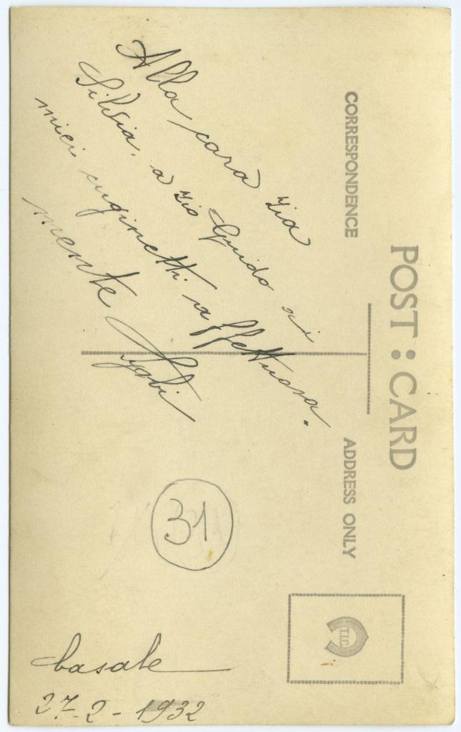 | iscrizioni | sul verso del supporto secondario la dedica "Alla cara zia Silvia, a zio Guido ai miei cuginetti affettuosamente Gabi/ Casale 27-2-1932" |