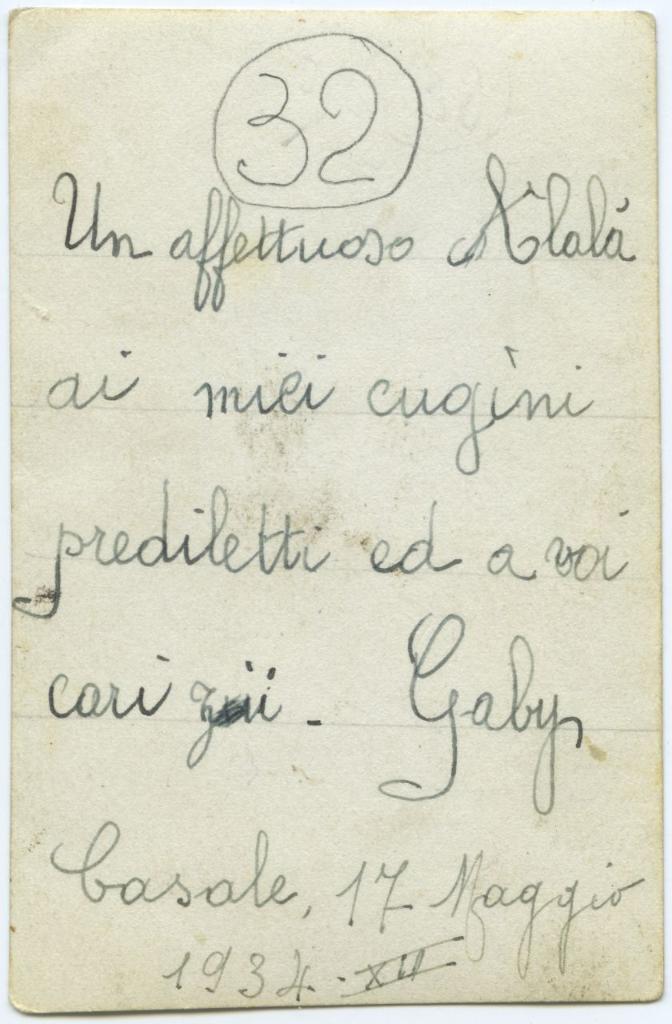 | iscrizioni | sul verso del supporto secondario la dedica "Un affettuoso Alalà ai miei cugini prediletti ed a voi cari zii. Gaby/ Casale 17 Maggio 1934 XII" |