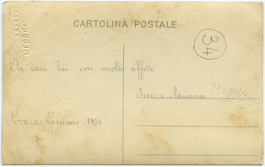 | iscrizioni | sul verso del supporto la dedica "Ai cari Zii con molto affetto Ines e Adriana [Muggia]/ Novara - Gennaio 1936" |