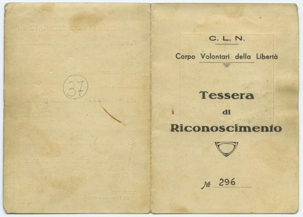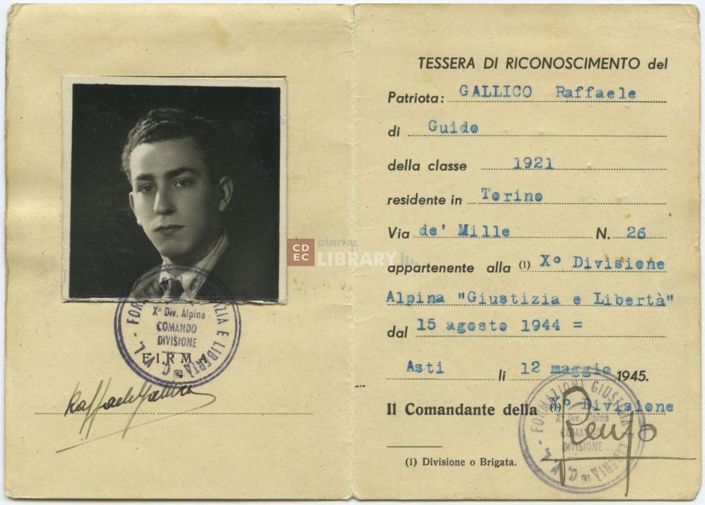 | osservazioni | Il documento fu emesso da Corpo Volontari della Libertà del C.L.N. Comando di Liberazione Nazionale. La tessera di riconoscimento N. 296 fu rilasciata al "Patriota Gallico Raffaele di Guido della classe 1921/ residente in Torino via de' Mille N. 26/ appartenente alla X° Divisione Alpina "Giustizia e Libertà", firmata da "Renzo/ Comandante della X° Divisione" e controfirmata dallo stesso Raffaele Gallico al quale, per la sua attività partigiana, fu concessa nel febbraio 1952 la Croce al Merito di guerra. |