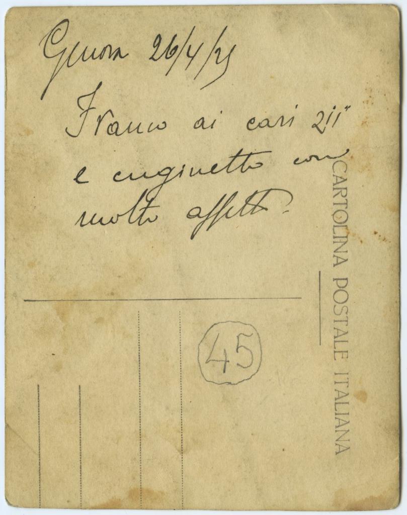 | iscrizioni | sul verso del supporto la dedica "Genova 26/4/25 Franco ai cari zii e cuginetto con molto affetto" |