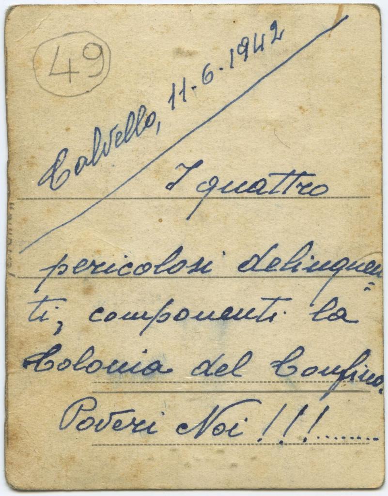 | iscrizioni | sul verso del supporto l'indicazione manoscritta a penna "Calvello, 11-6-1942/ I quattro pericolosi delinquenti, componenti la Colonia del Confino. Poveri Noi!!!........." |