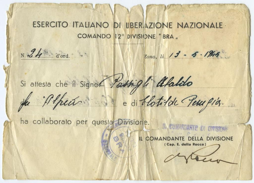 | osservazioni | Il documento attesta che Ubaldo Passigli collaborò con la 12° Divisione "Bra" dell'Esercito italiano di Liberazione Nazionale; fu firmato dal Comandante della Divisione Capitano E. della Rocca |