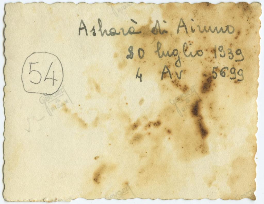 | iscrizioni | sul verso del supporto l'indicazione manoscritta a penna "Asharà di Airuno/ 20 luglio 1939/ 4 Av 5699" |