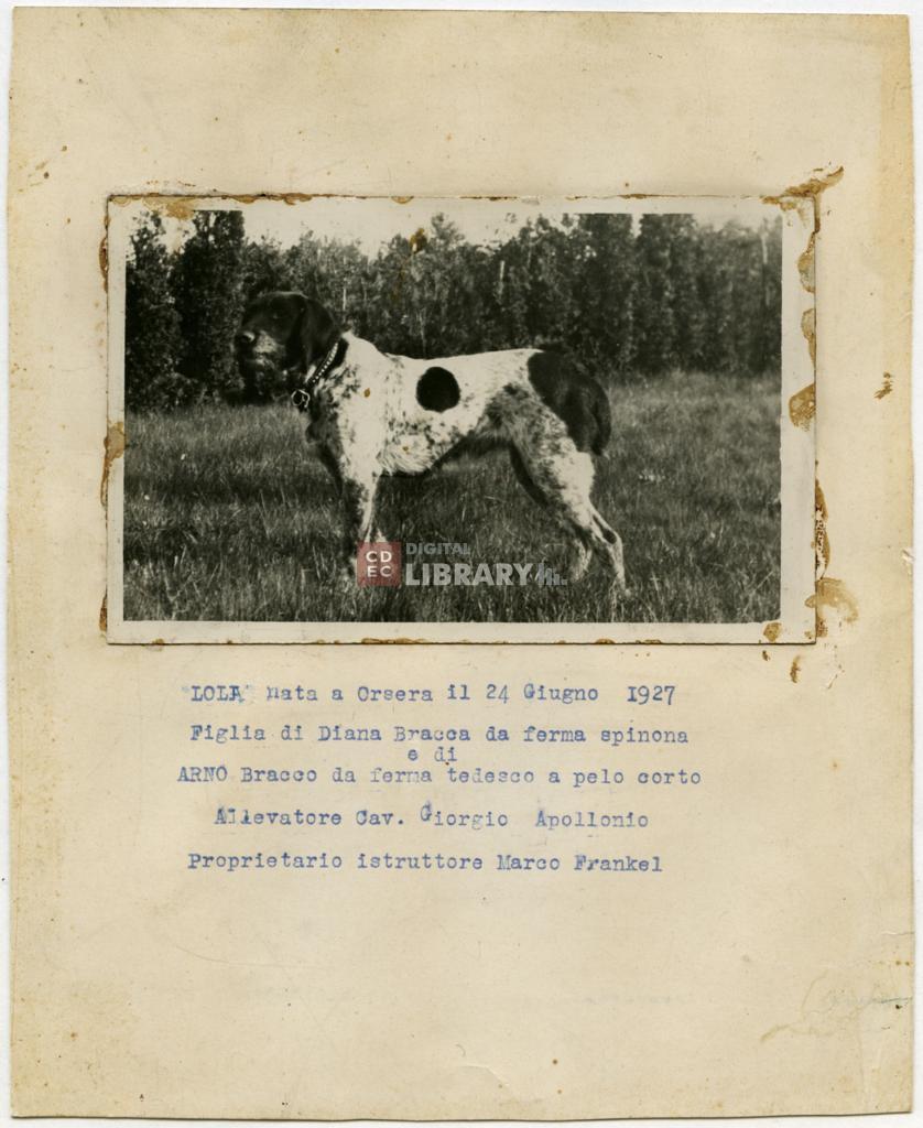 iscrizioni | sul recto del supporto secondario รจ presente l'indicazione dattiloscritta: "Lola, nata a Orsera il 24 giugno 1927/ Figlia di Diana bracca da ferma spinona e di Arno, bracco da ferma tedesco dal pelo corto/ Allevatore Cav. Giorgio Apollonio/ Proprietario istruttore Marco Frankel" |