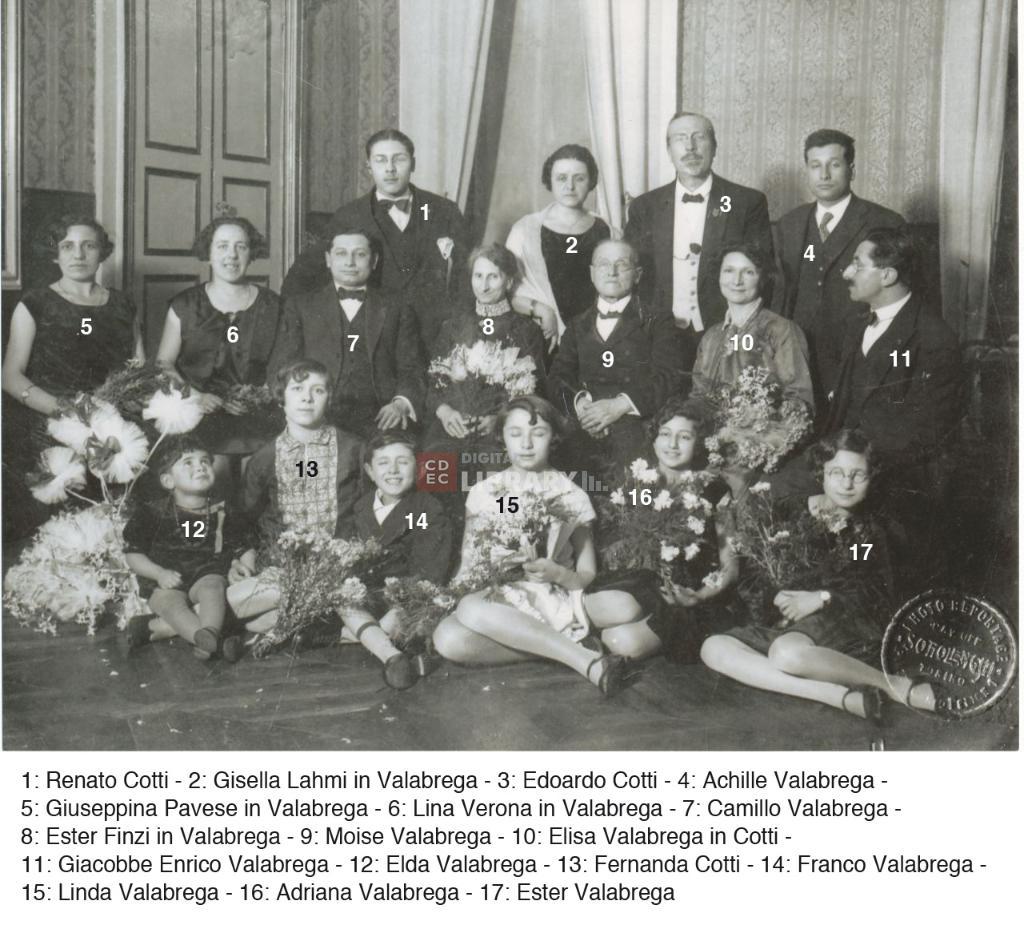 osservazioni | Nella fotografia si riconoscono 1: Renato Cotti, 2: Gisella Lahmi in Valabrega, 3: Edoardo Cotti, 4: Achille Valabrega, 5: Giuseppina Pavese in Valabrega, 6: Lina Verona in Valabrega (deportata e sopravvissuta alla Shoah), 7: Camillo Valabrega, 8: Ester Finzi in Valabrega, 9: Moise Valabrega, 10: Elisa Valabrega in Cotti, 11: Giacobbe Enrico Valabrega, 12: Elda Valabrega, 13: Fernanda Cotti, 14: Franco Valabrega, 15: Linda Valabrega (poi coniugata Levi), 16: Adriana Valabrega (poi coniugata De Benedetti), 17: Ester Valabrega. L'identificazione delle persone รจ desunta dal confronto con la fotografia inv. 745-001 |
