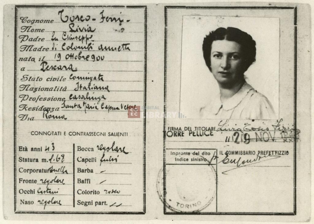 | iscrizioni | La carta d'identità con false generalità di Livia Terracini in Tedesco risulta emessa il 29 novembre 1943 dal Comune di Torre Pellice (in provincia di Torino) |