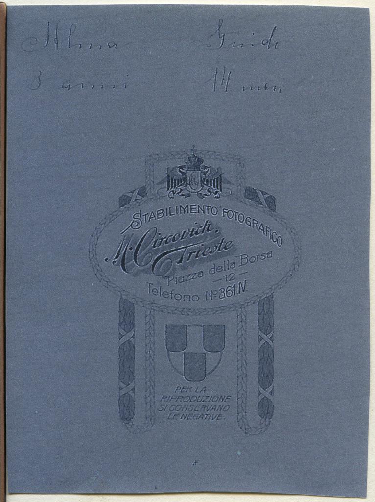 | iscrizioni | sul verso del supporto l'indicazione manoscritta "Alma 3 anni/ Guido 14 mesi" |