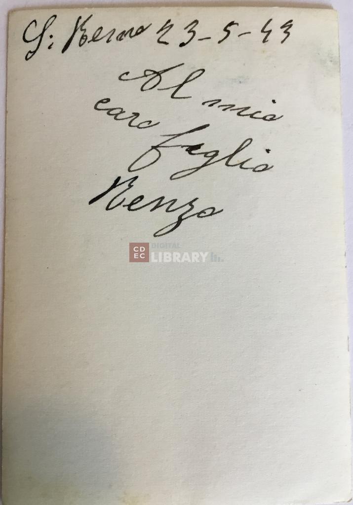 iscrizioni | sul verso del supporto la dedica "S. Remo 23-5-43/ Al mio caro figlio Renzo" |