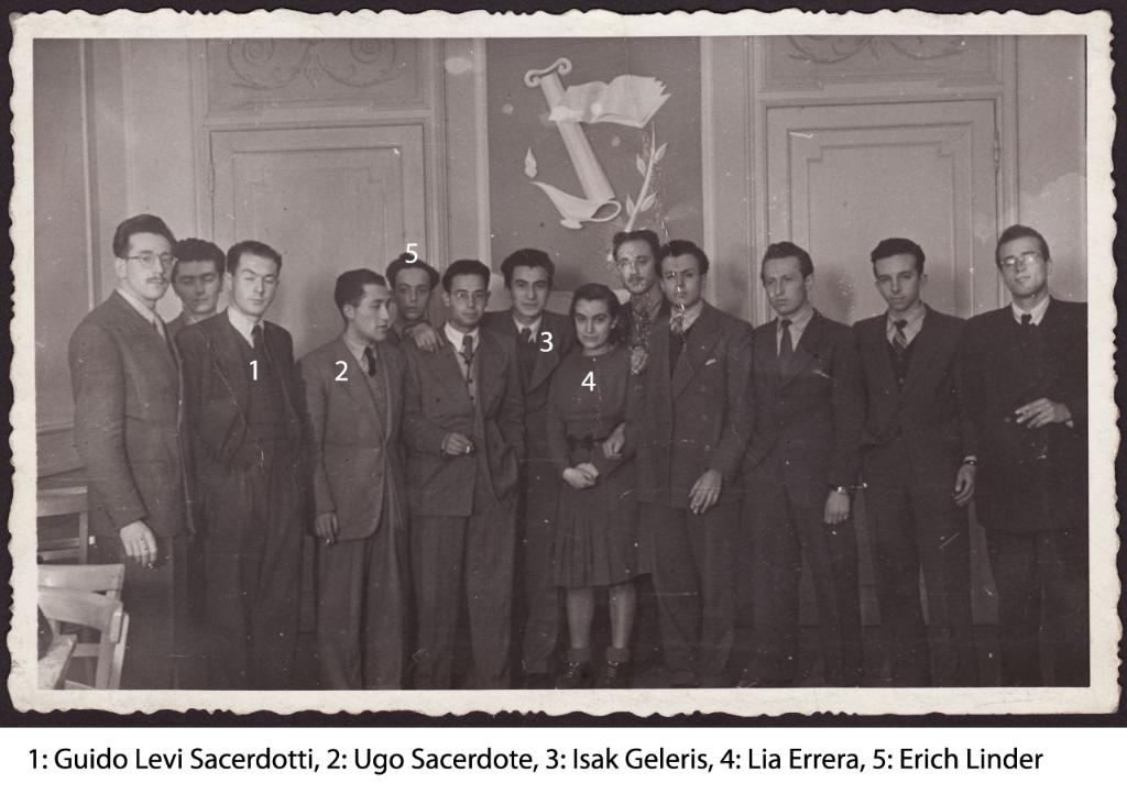 | osservazioni | La fotografia è stata eseguita al Raduno internazionale degli studenti ebrei del mondo; si riconoscono 1: Guido Levi Sacerdotti, 2: Ugo Sacerdote, 3: Isak Geleris, 4: Lia Errera, 5: Erich Linder; nel gruppo è inoltre presente ma non identificato Luciano Coen |