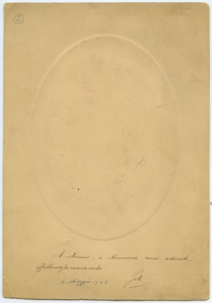 | iscrizioni | sul recto del supporto secondario in basso a destra firma [illeggibile] del fotografo - sul verso del supporto la dedica "A Nonno, a Nonnina miei adorati, affettuosissimamente/ 6 Maggio 1924/ Jole" |