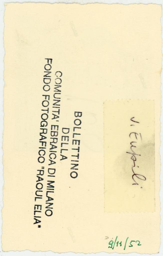 | timbri, marchi | sul verso del supporto il timbro a inchiostro "Bollettino della Comunità ebraica di Milano/ Fondo fotografico "Raoul Elia" |