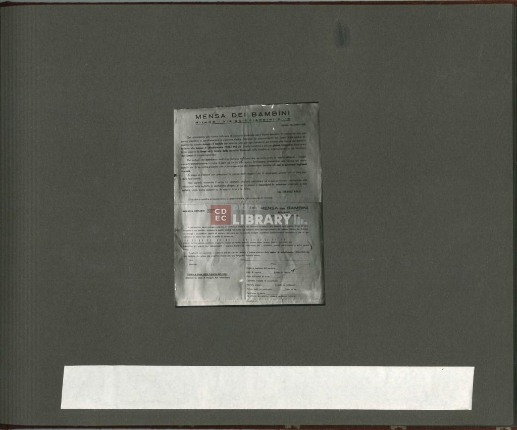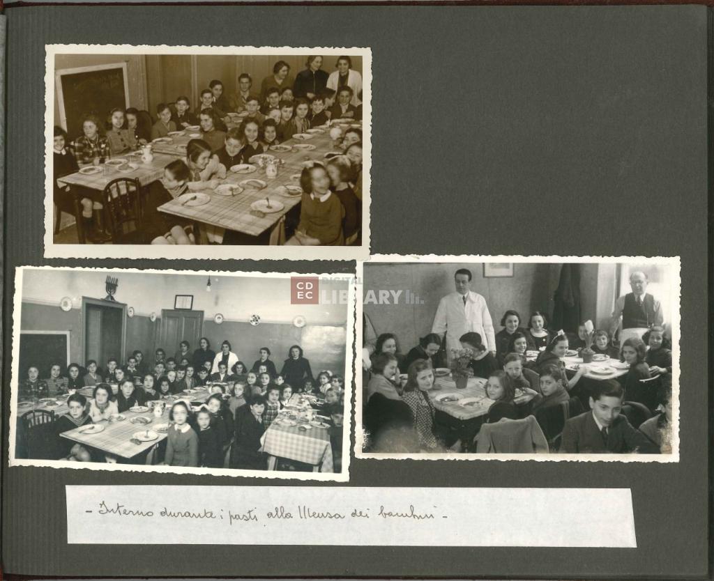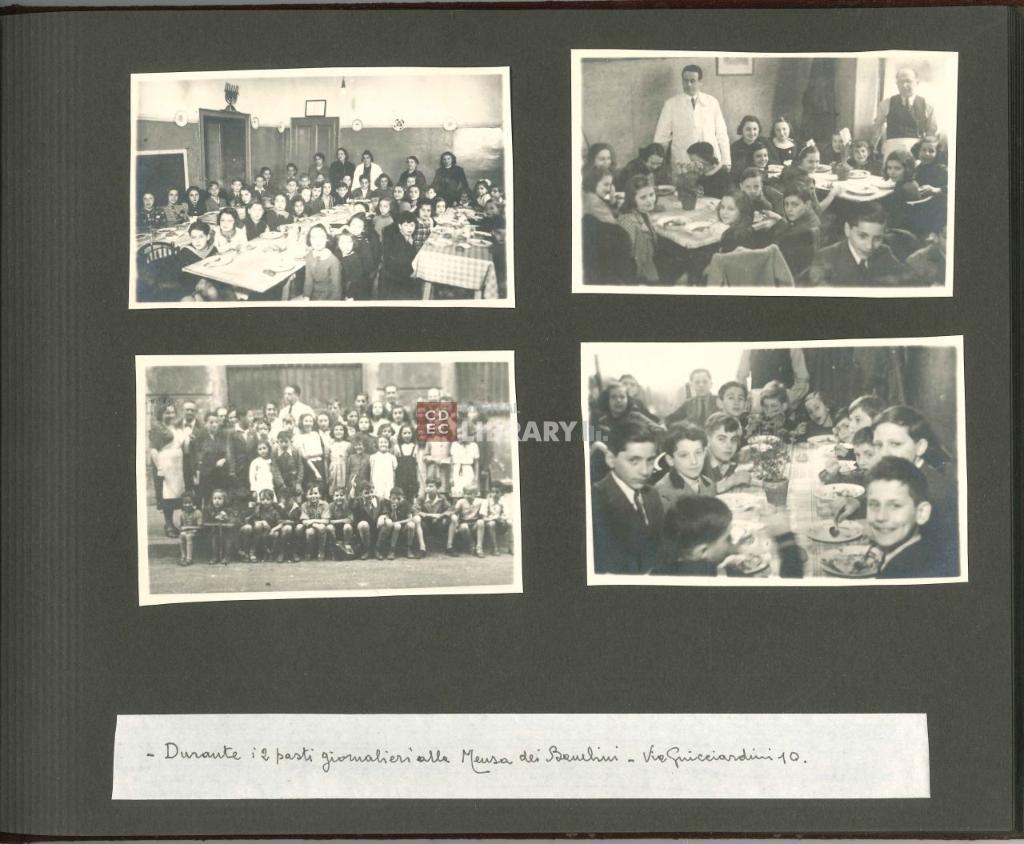 osservazioni | L'album intitolato "Mensa dei Bambini" ritrae gli ospiti dell'istituto sia all'interno dei locali, sia all'esterno durante gite e momenti di svago e alcuni scatti della sede di via Guicciardini 10 distrutta dai bombardamenti aerei; vi si trova inoltre riprodotto il modulo per la richiesta di vestiario per i bambini internati e alcune cartoline d'auguri per il Capodanno ebraico del 1941 e il Capodanno civile del 1942. In alcuni ritratti di gruppo si riconoscono Israel Kalk e il violinista Arturo Karpeles (internato e poi deportato). Nella controcopertina dell'album è riportata l'indicazione di "Copyright by dr. ing. Israel Kalk - Milano". |