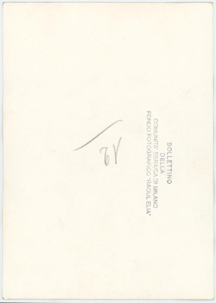 | timbri, marchi | sul verso del supporto il timbro a inchiostro "Bollettino della Comunità ebraica di Milano/ Fondo fotografico "Raoul Elia" |