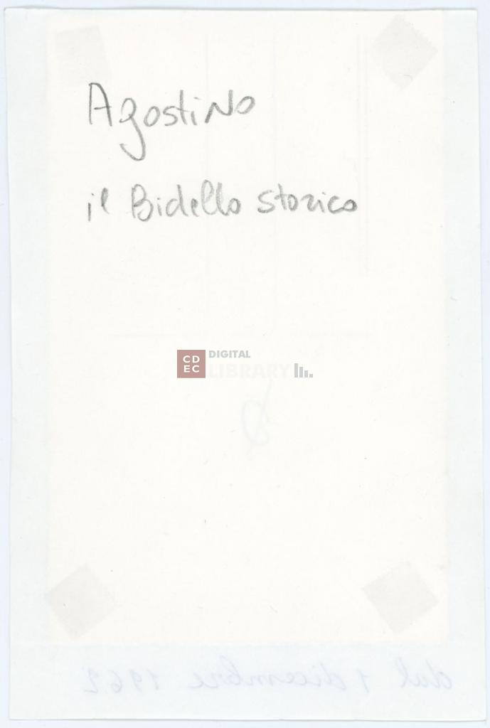 | iscrizioni | sul recto del supporto secondario iscrizione manoscritta "dal 1 dicembre 1962" - sul verso del supporto secondario iscrizione manoscritta "Agostino il Bidello storico" |