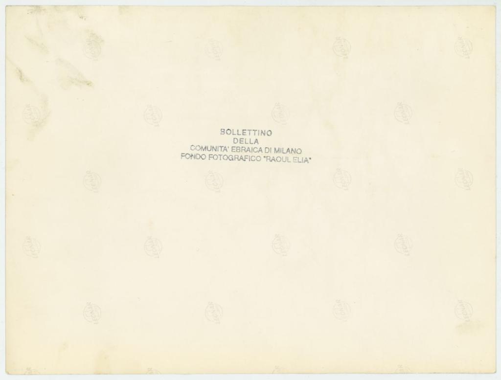 | timbri, marchi | sul verso del supporto timbro a inchiostro "Bollettino della Comunità Ebraica di Milano/ Fondo Fotografico "Raoul Elia" |
