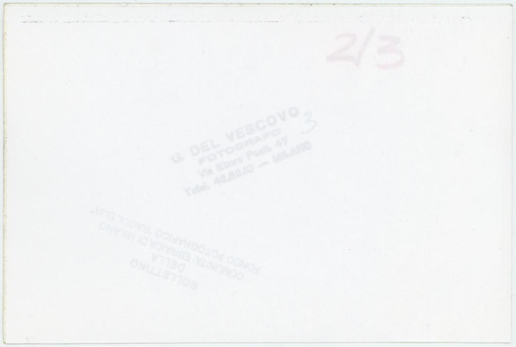 | timbri, marchi | sul verso del supporto il timbro a inchiostro "Bollettino della Comunità ebraica di Milano/ Fondo fotografico "Raoul Elia" e il marchio commerciale del fotografo |
