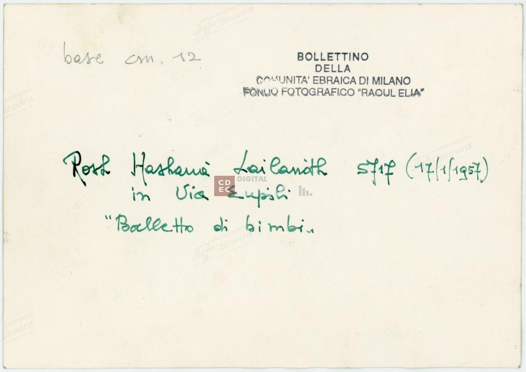 | iscrizioni | sul verso del supporto la didascalia manoscritta "Rosh ha shanà Lailanoth 5717 (17/1/1957) in via Eupili/ Balletto di bimbi" e indicazioni tipografiche |