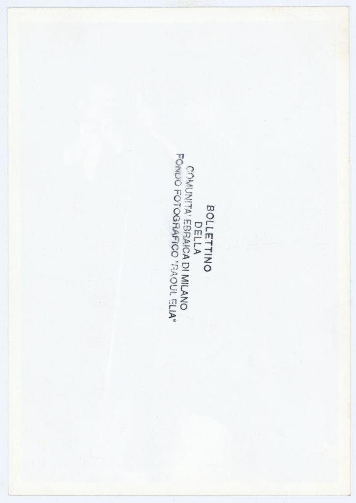 | timbri, marchi | sul verso del supporto il timbro a inchiostro "Bollettino della Comunità ebraica di Milano/ Fondo Fotografico "Raoul Elia" |