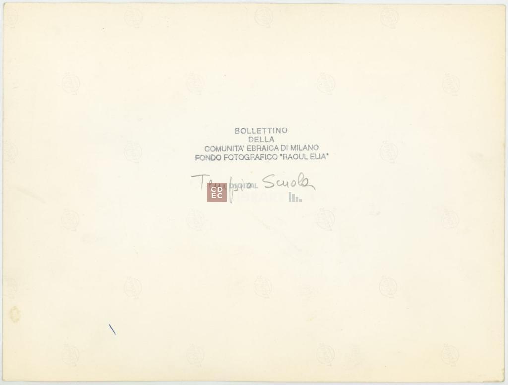 | timbri, marchi | sul verso del supporto il timbro a inchiostro "Bollettino della Comunità ebraica di Milano/ Fondo Fotografico "Raoul Elia" |