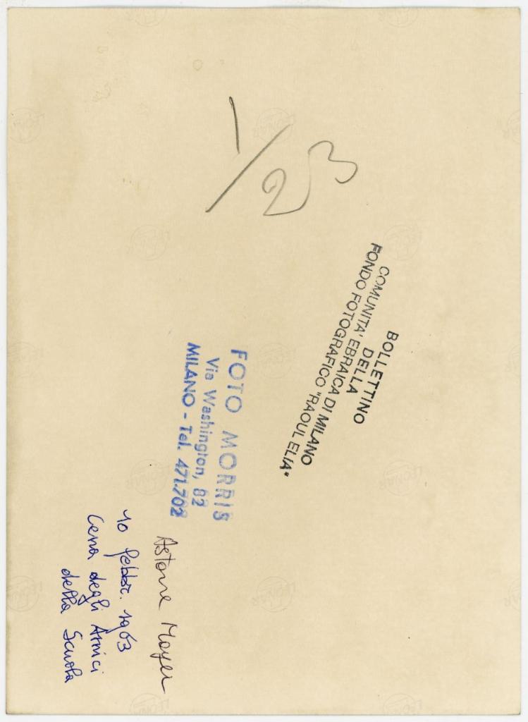 | timbri, marchi | sul verso del supporto il timbro a inchiostro "Bollettino della Comunità ebraica di Milano/ Fondo fotografico "Raoul Elia" e il timbro a inchiostro blu con il marchio commerciale del fotografo |