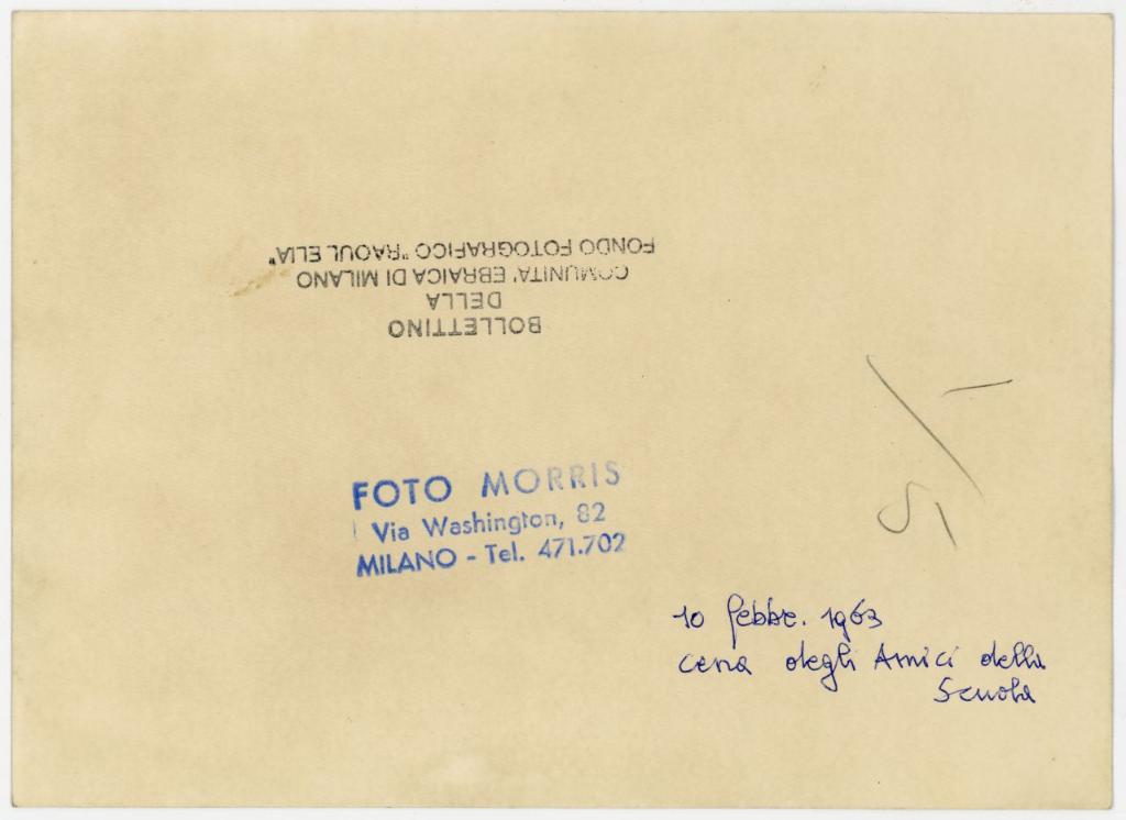 | timbri, marchi | sul verso del supporto il timbro a inchiostro "Bollettino della Comunità ebraica di Milano/ Fondo Fotografico "Raoul Elia" e il timbro a inchiostro blu con il marchio commerciale del fotografo |