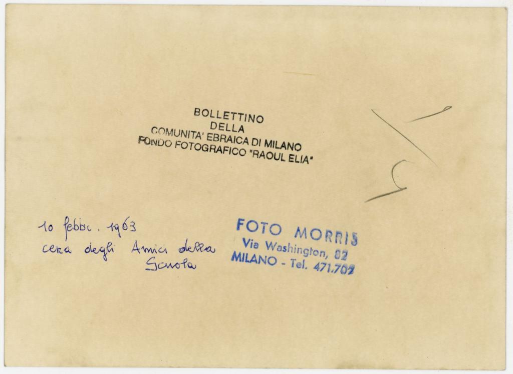 | timbri, marchi | sul verso del supporto il timbro a inchiostro "Bollettino della Comunità ebraica di Milano/ Fondo Fotografico "Raoul Elia" e il timbro a inchiostro blu con il marchio commerciale del fotografo |