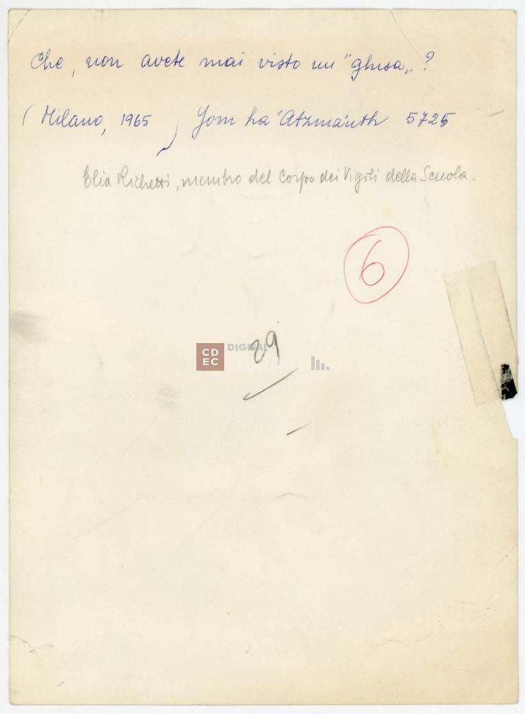 | iscrizioni | sul verso del supporto l'indicazione manoscritta a penna da Elia Richetti "Che, non avete mai visto un "ghisa"?/ (Milano, 1965) Yom ha' Atzmauth 5725" e a matita "Elia Richetti, membro del Corpo dei Vigili della Scuola" |