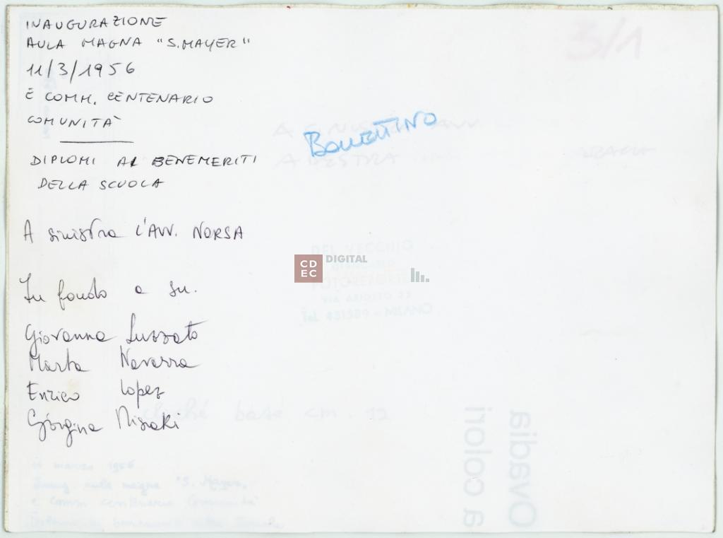 iscrizioni | sul verso del supporto primario le iscrizioni manoscritte "a sinistra avv. Norsa/ a destra ing. Aldo Jarach" e in basso a sinistra "11 marzo 1956 Inaug. aula magna "S. Mayer" e comm. centenario Comunità - Diplomi ai benemeriti della Scuola"; sul verso del supporto secondario le iscrizioni manoscritte "Bollettino" e "Inaugurazione aula magna "S. Mayer" 11/03/1956 e comm. centenario comunità/ diplomi ai benemeriti della scuola/ a sinistra l'avv. Norsa/ in fondo e su Giovanna Luzzato Marta Navarra Enrico Lopez Giorgina Misraki" |