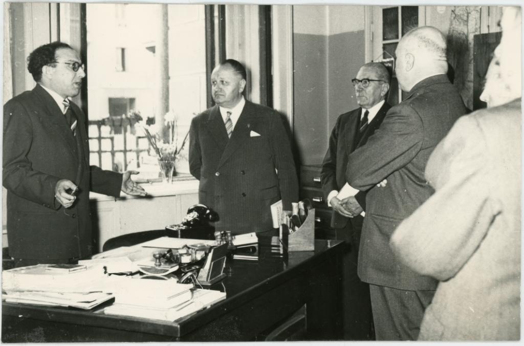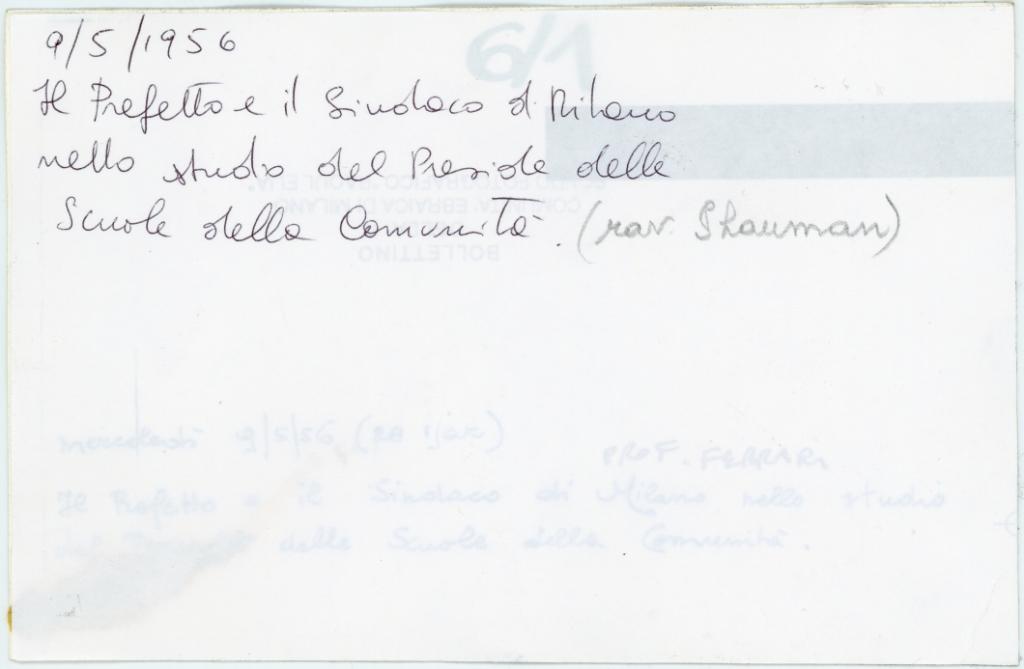| iscrizioni | sul verso del supporto l'iscrizione manoscritta "9/05/1956 Il prefetto e il sindaco di Milano nello studio del preside delle Scuole della comunità (Rav Schauman) " |