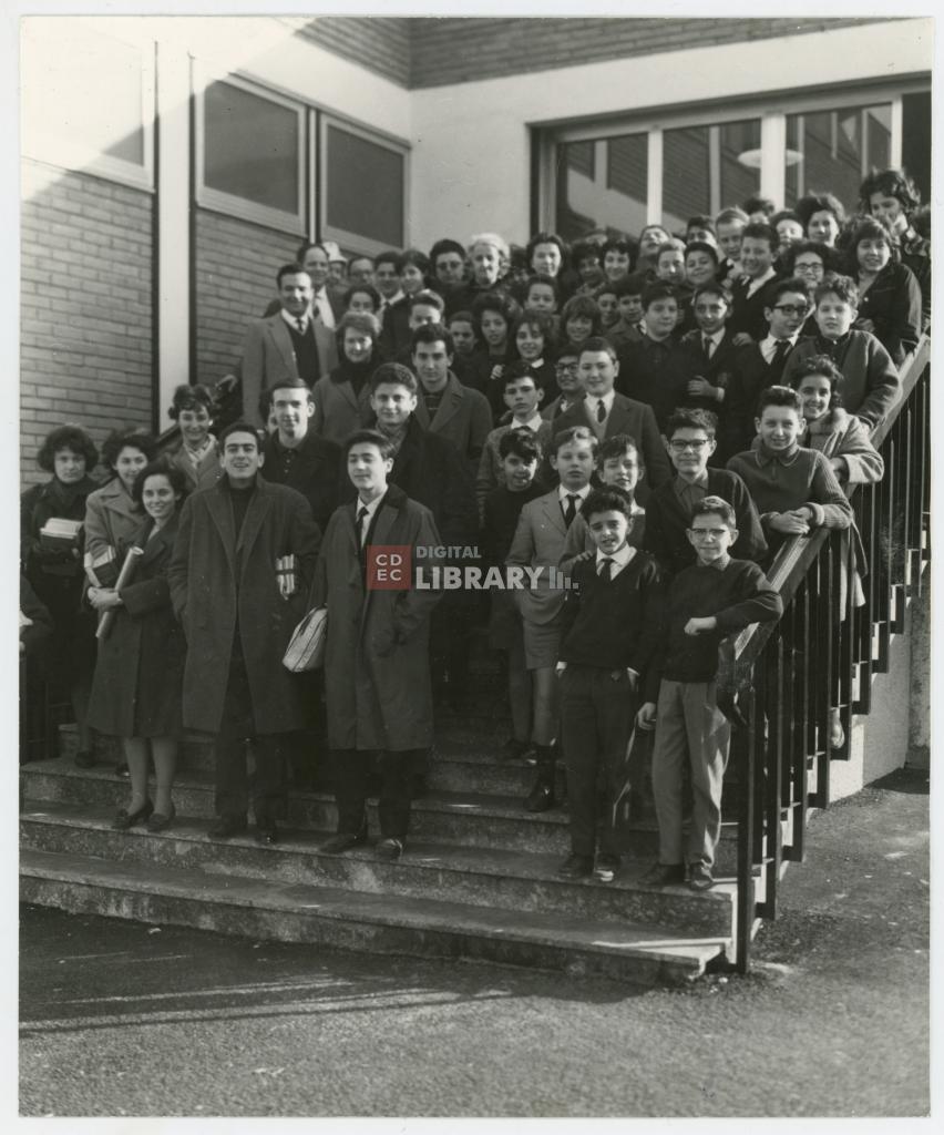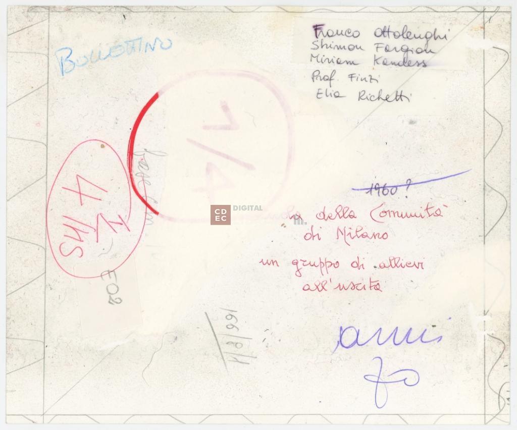 iscrizioni | sul verso del supporto iscrizione manoscritta in penna rossa "Scuola della Comunità/ di Milano/ un gruppo di allievi all'uscita"; in alto a destra iscrizione manoscritta a penna nera "Franco Ottolenghi/ Shimon Fargion/ Miriam Kauders/ Prof. Finzi/ Elia Richetti" |