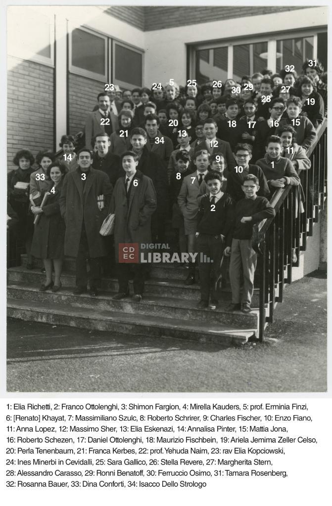 osservazioni | Nella fotografia si riconoscono 1: Elia Richetti, 2: Franco Ottolenghi, 3: Shimon Fargion, 4: Mirella Kauders (poi coniugata Nissim), 5: prof. Erminia Deangelis in Finzi, 6: [Renato] Khayat, 7: Massimiliano Szulc, 8: Roberto Schirer, 9: Charles Fischer, 10: Enzo Fiano, 11: Anna Lopez, 12: Massimo Sher, 13: Elia Eskenazi, 14: Annalisa Pinter, 15: Mattia Jona, 16: Roberto Schezen, 17: Daniel Ottolenghi, 18: Maurizio Fischbein, 19: Ariela Jemima Zeller Celso, 20: Perla Tenenbaum, 21: Franca Kerbes, 22: prof. Yehuda Naim, 23: rav Elia Kopciowski, 24: Ines Minerbi in Cividali, 25: Sara Gallico, 26: Stella Revere, 27: Margherita Stern, 28: Alessandro Carasso, 29: Ronni Benatoff, 30: Ferruccio Osimo, 31: Tamara Rosenberg, 32: Rosanna Bauer, 33: Dina Conforti, 34: Isacco Dello Strologo |